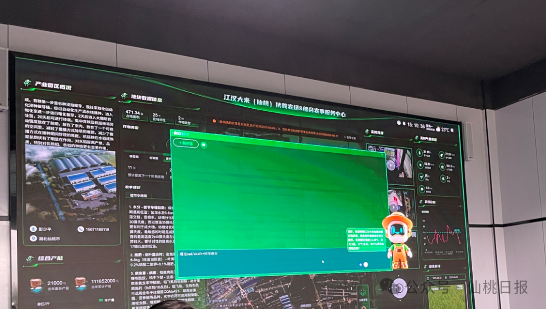 “歡迎光臨仙桃江漢大米伏羲農場,風力二級,天氣多云……”電子大屏上,AI精靈助手播報完天氣,農場巡護人員發出“啟動無人機巡檢任務”的指令。