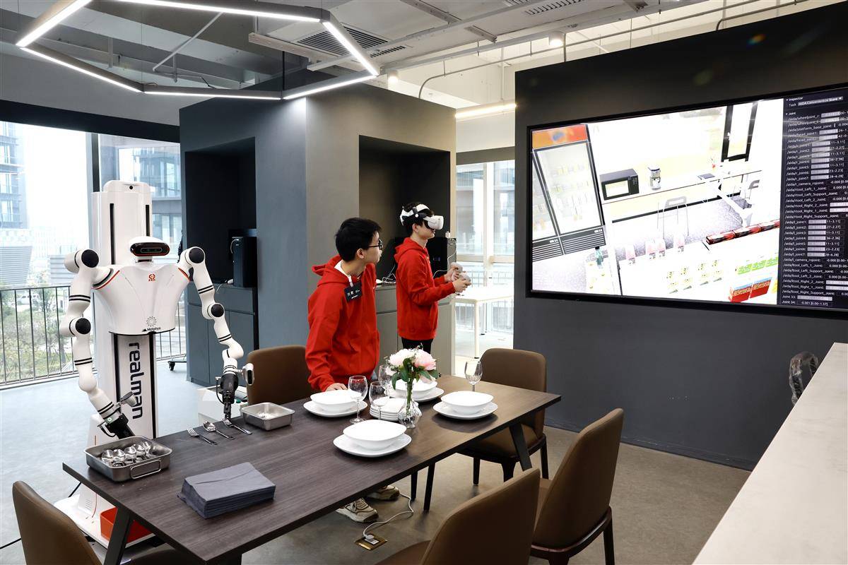 在簽約當天的開放體驗環節,記者穿戴VR設備進入虛擬世界,親身引導機器人學習。當記者在虛擬超市從貨架上取下飲料時,現實中的機器人立刻“秒懂”,同步完成取物動作;在虛擬臥室,記者疊好被子,機器人隨即將被子折成整齊的“豆腐塊”。