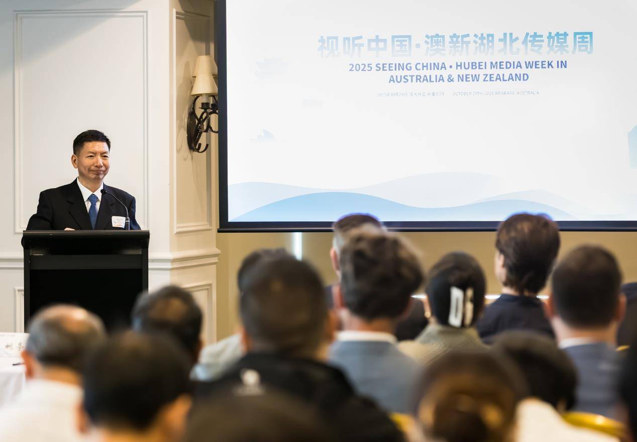 當?shù)貢r間10月29日,2025視聽中國·澳新湖北傳媒周B2B產(chǎn)業(yè)洽談會在澳大利亞布里斯班成功舉辦。中國駐澳大利亞布里斯班總領(lǐng)事館領(lǐng)事董俞濱、昆士蘭州議員馬克·弗納、布里斯班市政府副議長黃文毅、昆士蘭州電視電影局創(chuàng)意產(chǎn)業(yè)孵化處處長杰德·道森等出席活動,中共湖北省委講師團主任姚亭華代表主辦方致歡迎辭。