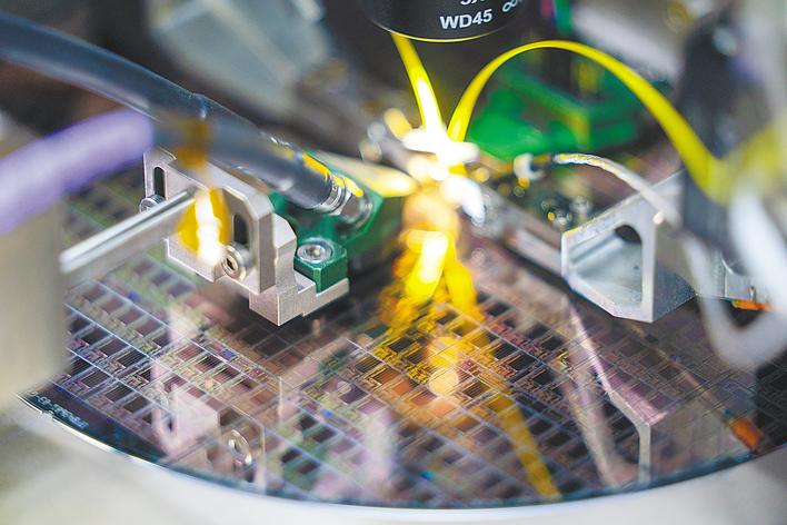 國(guó)家信息光電子創(chuàng)新中心無塵實(shí)驗(yàn)室內(nèi),一片晶圓正被切割成一顆顆芯片。(湖北日?qǐng)?bào)全媒記者 魏錸 攝)