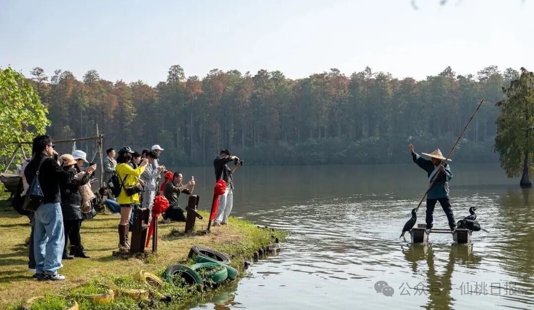 大V們漫步農耕文化一條街,觀摩辣椒、花生、玉米等農作物,感受豐收的喜悅;駐足欣賞沔陽雕花剪紙的精巧技藝,觀看省級非遺代表性傳承人閔明輝手持大鼓的精彩演繹。乘一葉輕舟,駛入如夢似幻的水上森林,成片水杉倒映水面,楓葉點綴其間,宛如一幅流動的秋日畫卷。“走過全國不少地方,從沒見過這么大面積的水上池杉林,坐船穿梭其中,隨手一拍都是大片,像掉進了童話里!網絡大V“圈圈”滿眼興奮。水上婚禮的巧妙融入,更為這片意境增添了濃厚文化氣息。現場再現老沔陽漁民“以船為家、日出而作” 生活場景的演繹,將水鄉民俗的獨特韻味展現得淋漓盡致。