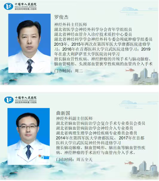 十堰市人民醫院神經外科2病區目前在腦血管性疾病和神經腫瘤的手術治療方面形成特色,具有成熟的技術流程,主要包括腦出血的各種微創手術,腦動脈瘤、腦血管畸形的開顱手術及血管內介入手術,頸動脈狹窄的內膜切除手術,顱內大血管閉塞的顱內外血管搭橋手術,各種神經腫瘤(腦膜瘤、垂體瘤、聽神經瘤、椎管內腫瘤等)的手術。( 江開芳)