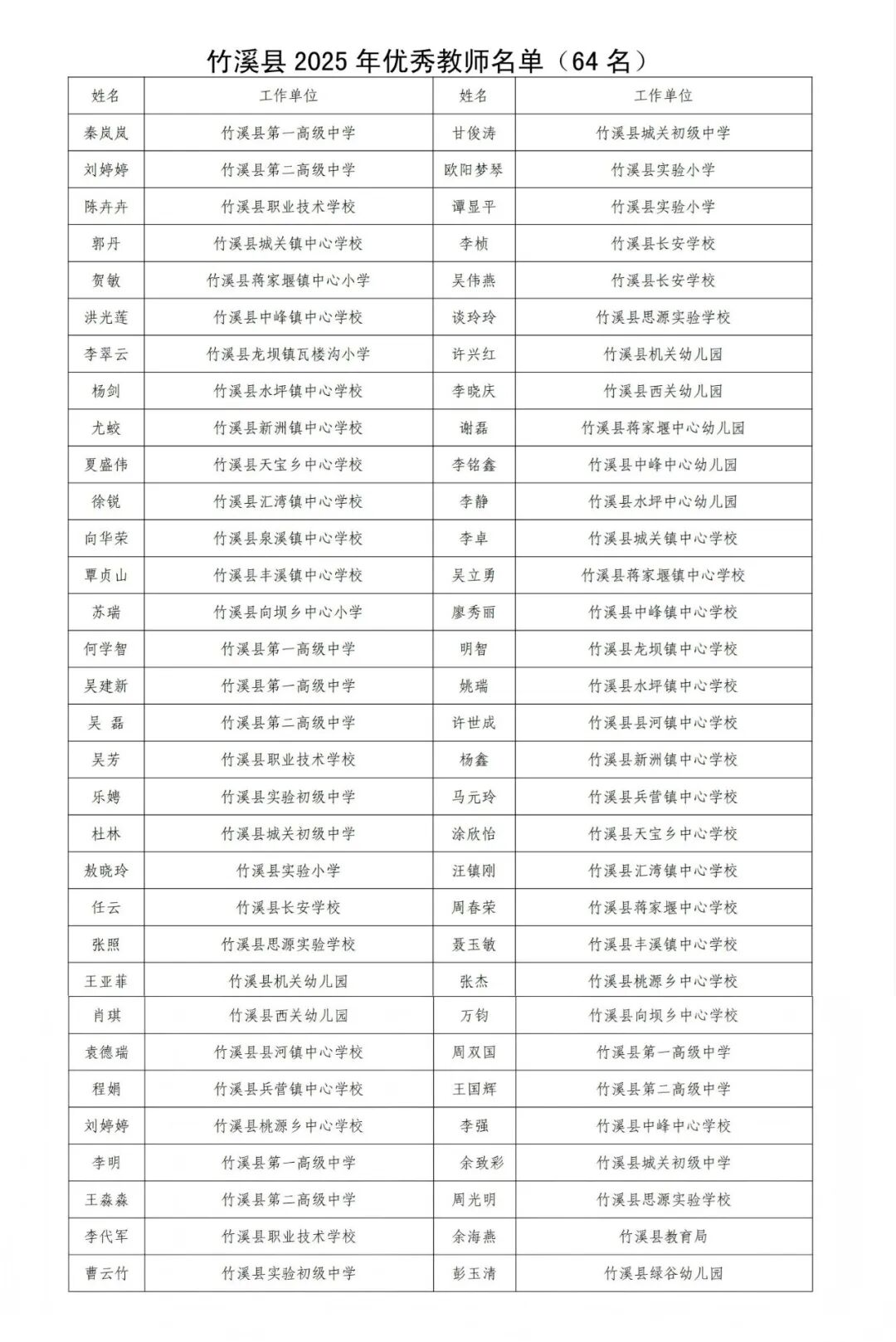 9月10日是第41個教師節(jié),為表揚先進(jìn)、樹立榜樣、激勵廣大教師愛崗敬業(yè)、立德樹人,十堰市教育局決定對在全市教育教學(xué)工作中表現(xiàn)突出的735名教師予以表揚。其中,竹溪縣64名優(yōu)秀教師光榮上榜,具體名單如下: