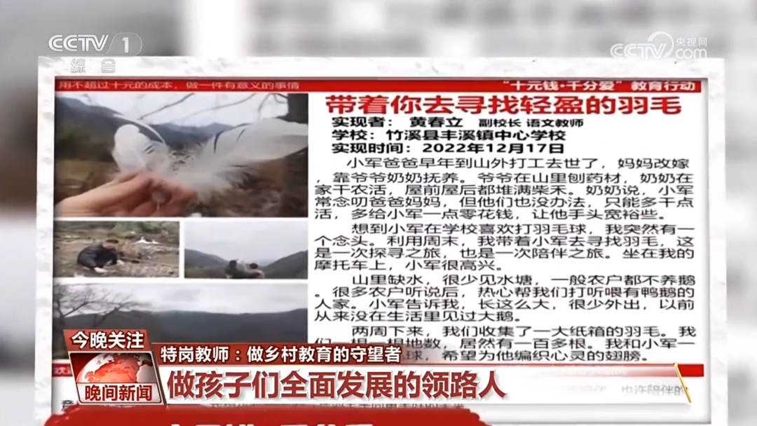 昨天(9月10日)是第41個教師節,昨晚央視CCTV-1《晚間新聞》欄目以《特崗教師:做鄉村教育的守望者》為題,報道了竹溪縣豐溪鎮中心學校教師黃春立,扎根大山13年,堅持以各種巧妙活動為學生開展思想品德教育實踐,讓每一個孩子都得到更全面的發展