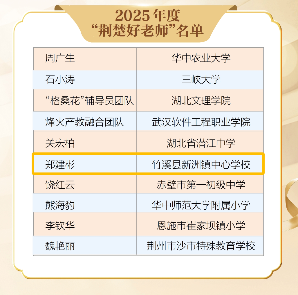 日前,2025年“荊楚好老師”名單正式發布,來自湖北各地的10名(組)優秀教師入選,其中竹溪縣新洲鎮中心學校教師鄭建彬,榜上有名。