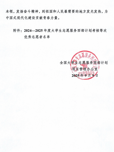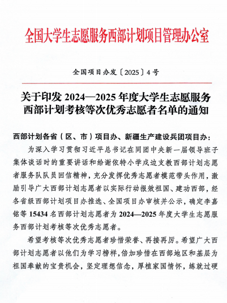 近日,經(jīng)各省級西部計(jì)劃項(xiàng)目辦推選,全國項(xiàng)目辦審核并公示,確定15434名西部計(jì)劃志愿者為2024-2025年度大學(xué)生志愿服務(wù)西部計(jì)劃考核等次優(yōu)秀志愿者。竹溪縣齊偉、王潤澤、朱玲玲、謝啟玉、王謝曌輝5人入選。