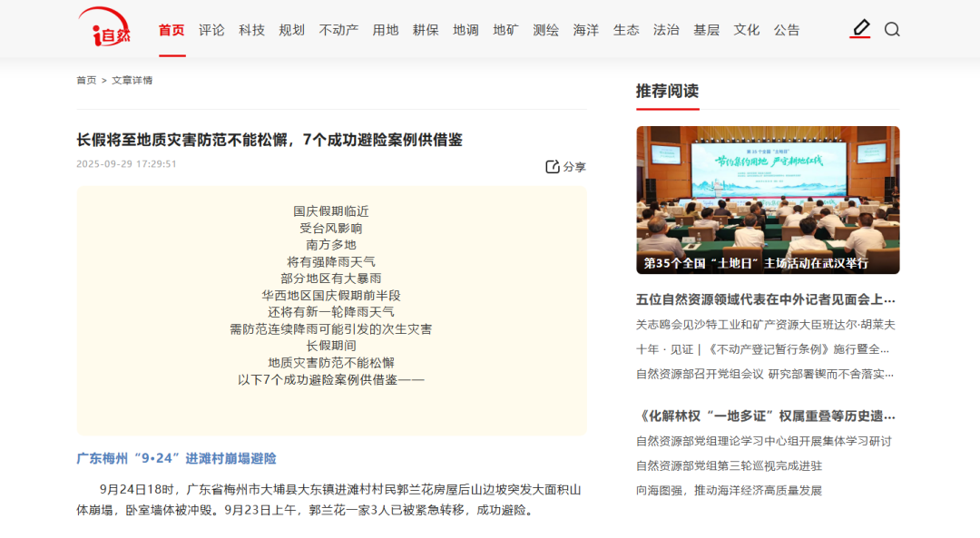 9月29日,自然資源部主管中國自然資源報社主辦的“i自然”網站發布消息,推薦全國的7個成功避險案例供借鑒,十堰市5個案例入選。竹溪縣水坪鎮劉家河村憑借迅速有效的泥石流避險行動上榜。
