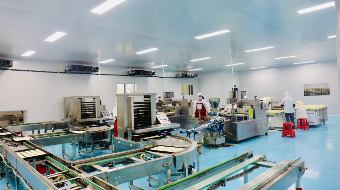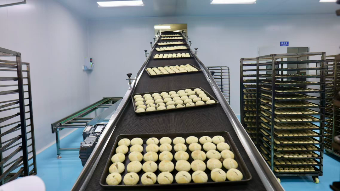 3000平方米的現代化無塵車間內,傳統手工工藝與智能化生產設備相互配合,空氣中彌漫著甜香,工人們正有條不紊地忙碌著——和面、包餡、壓模、烘烤,每一道工序都凝聚著二十年的技藝傳承。五仁、椰蓉、百果等多種口味的月餅,從這里生產、下線、包裝,并發往全國各地。