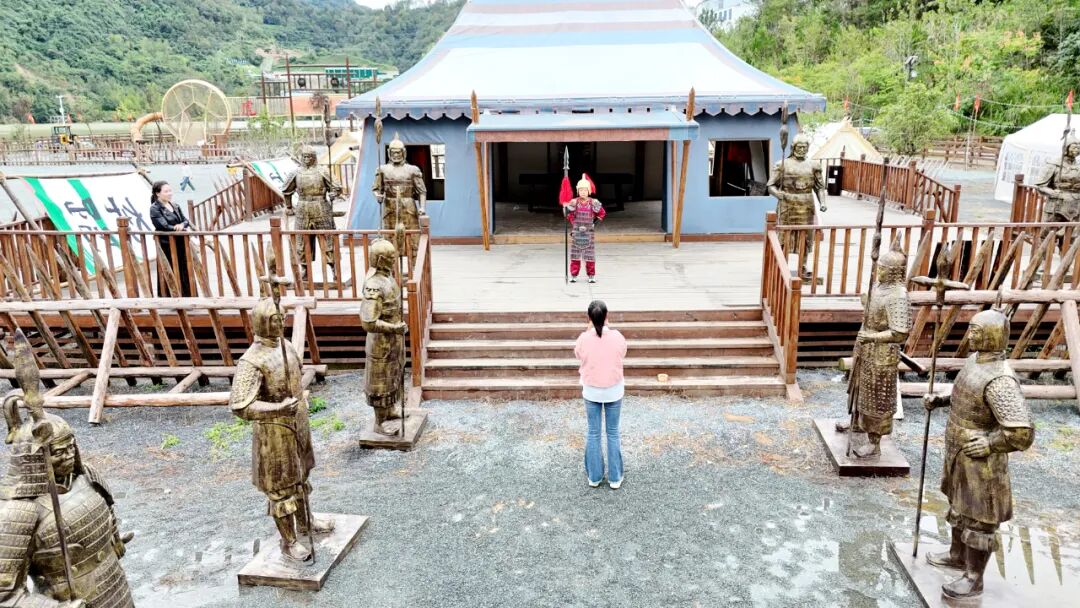 景區(qū)內(nèi)早已是人聲鼎沸,成了古風愛好者的“出片圣地”。游客們換上飄逸的漢服或威風的鎧甲,在瞭望塔上憑欄遠眺,在營帳前撫琴弄劍,快門聲此起彼伏,每個人都成了自己故事里的主角。