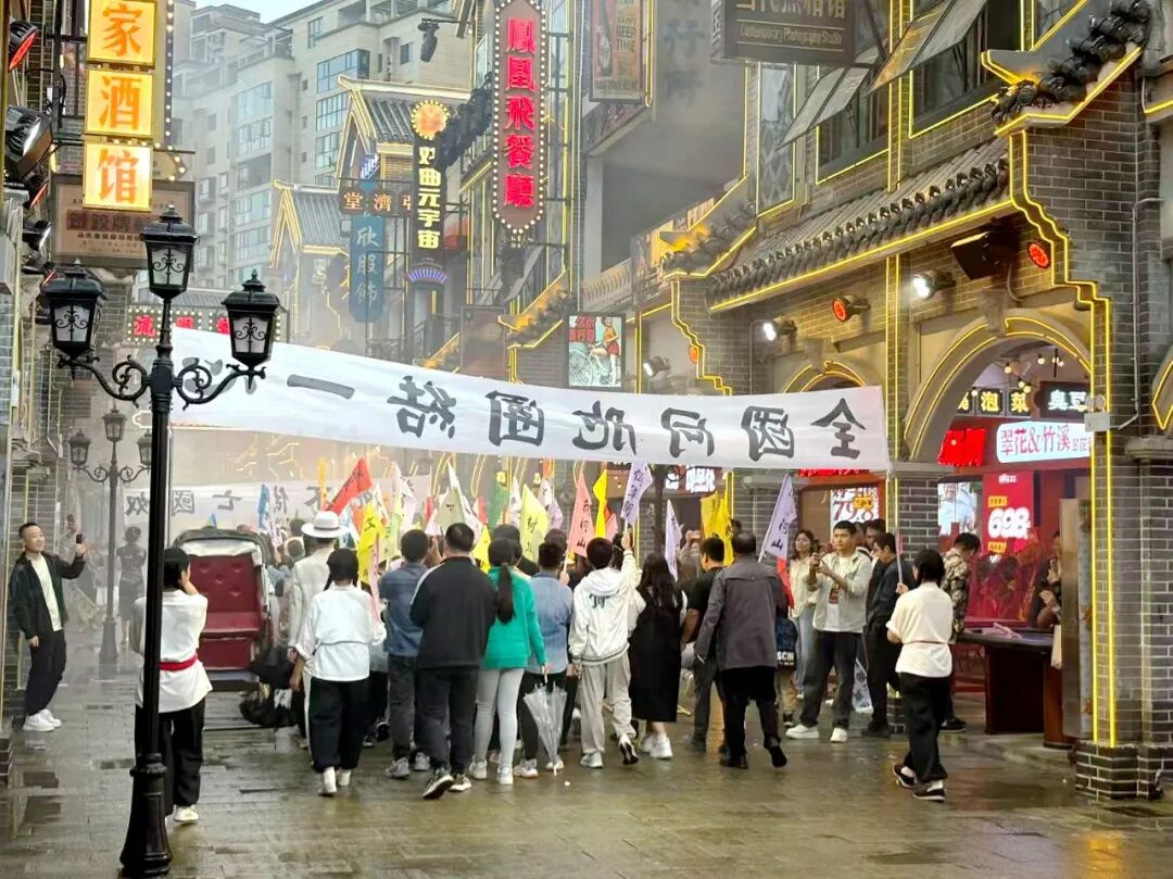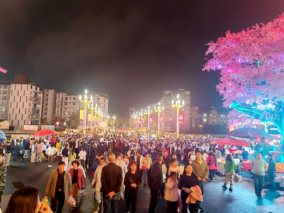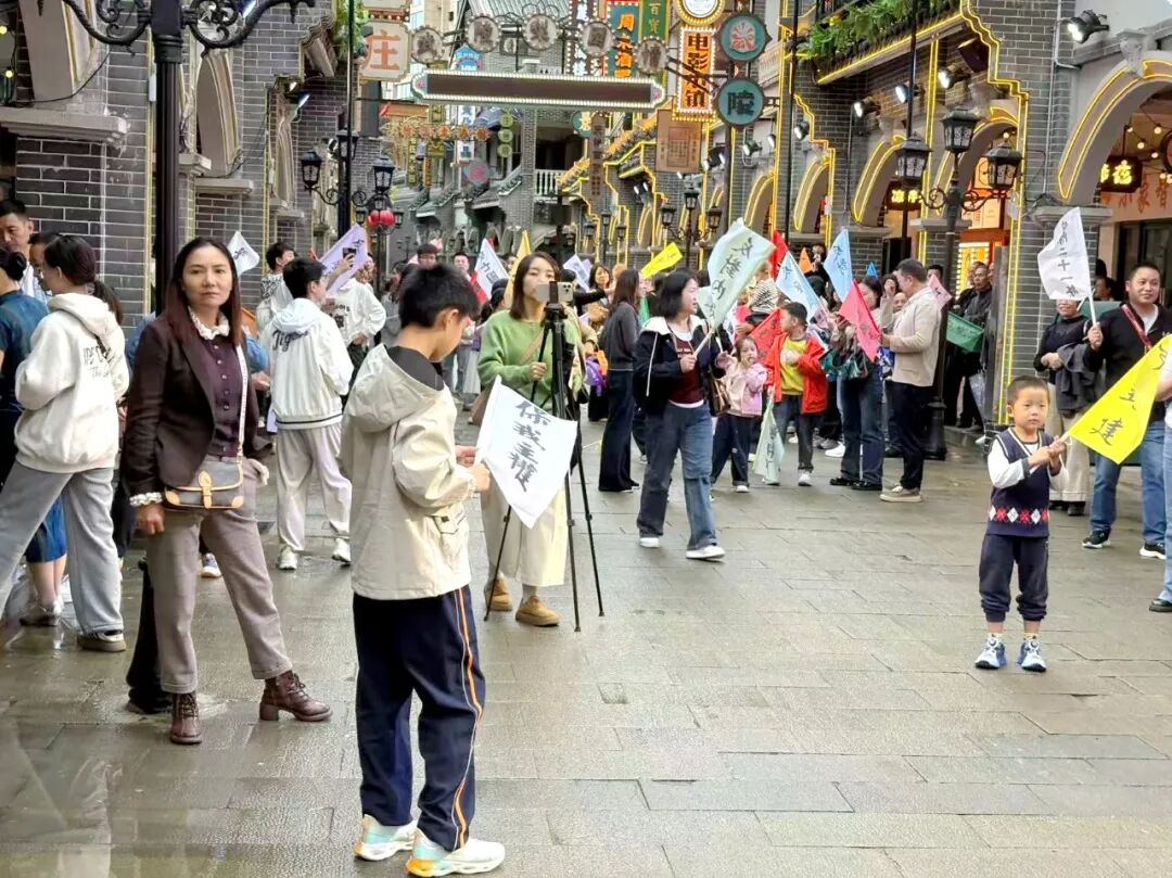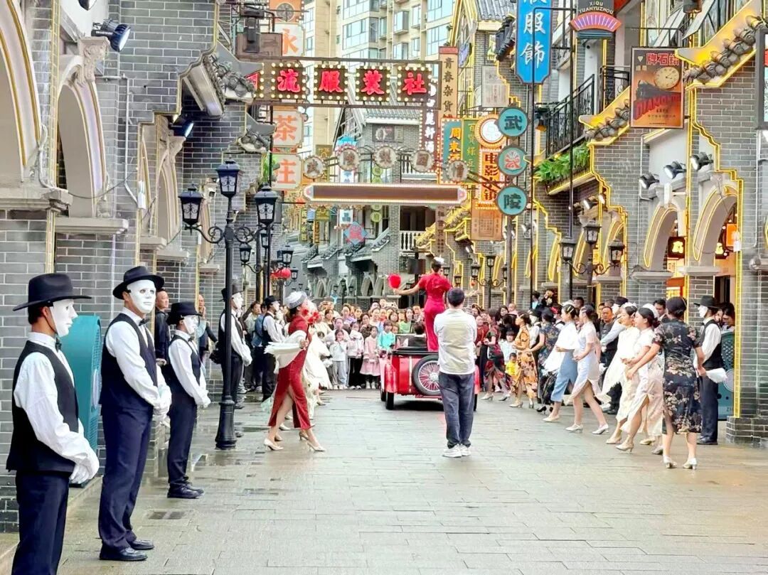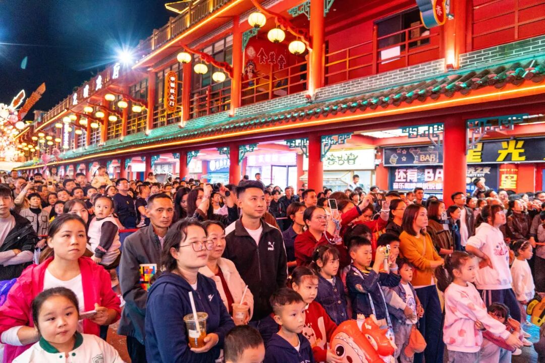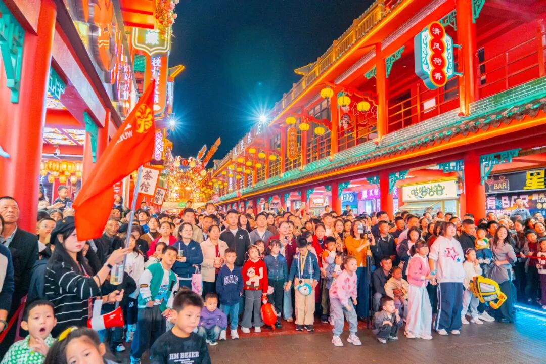 動感的音樂響起,游客們手舉五彩氣球隨節(jié)奏盡情搖擺,無數(shù)躍動的色彩點亮夜空,人們的笑容與閃爍的燈光交織,整個街區(qū)匯成一片歡樂的海洋,釋放著對假日的極致熱情!
