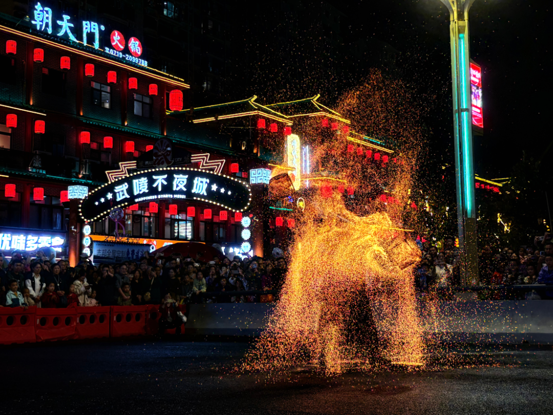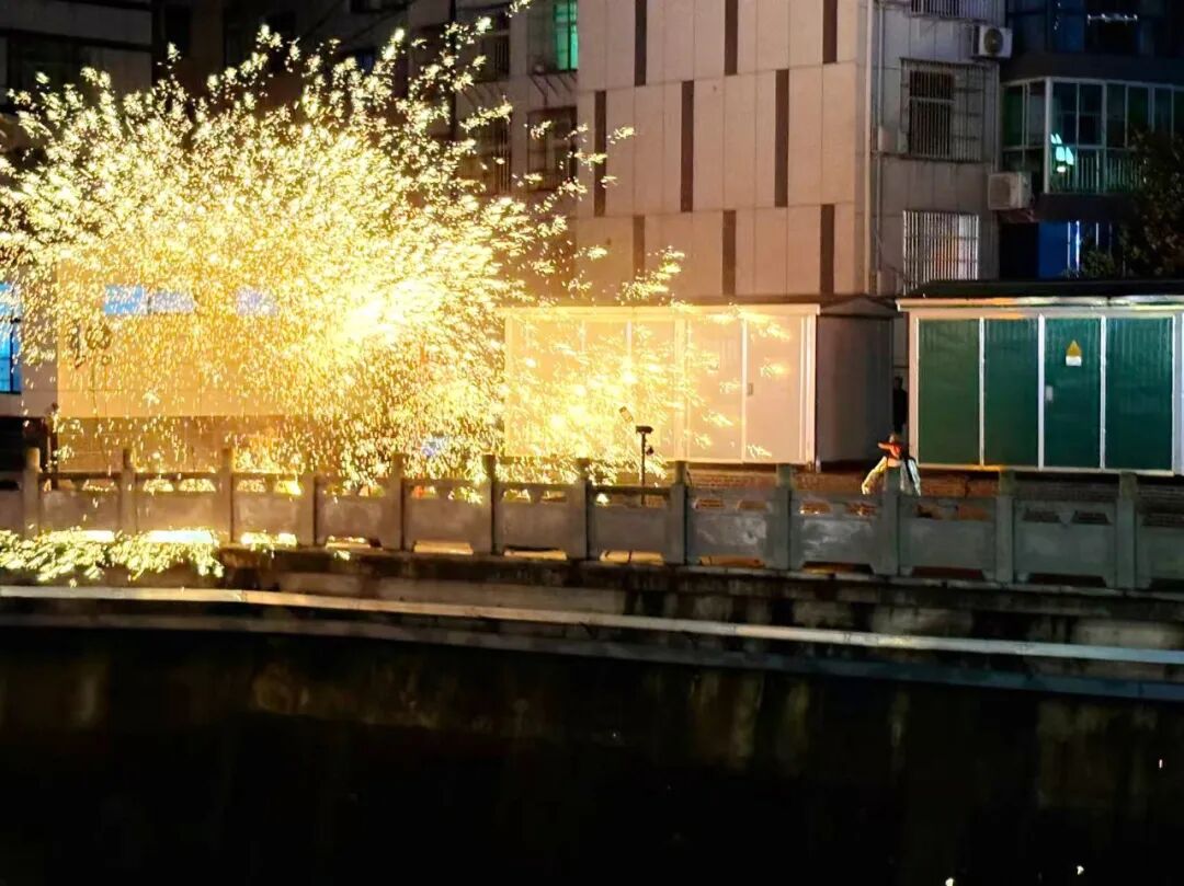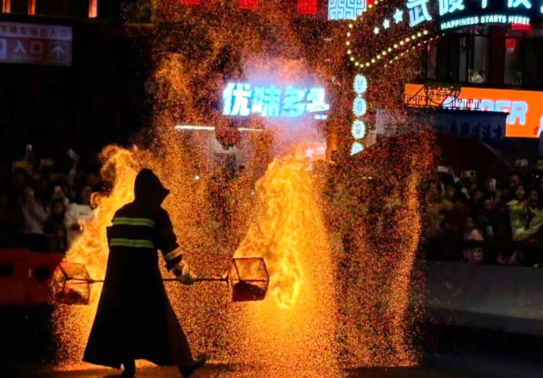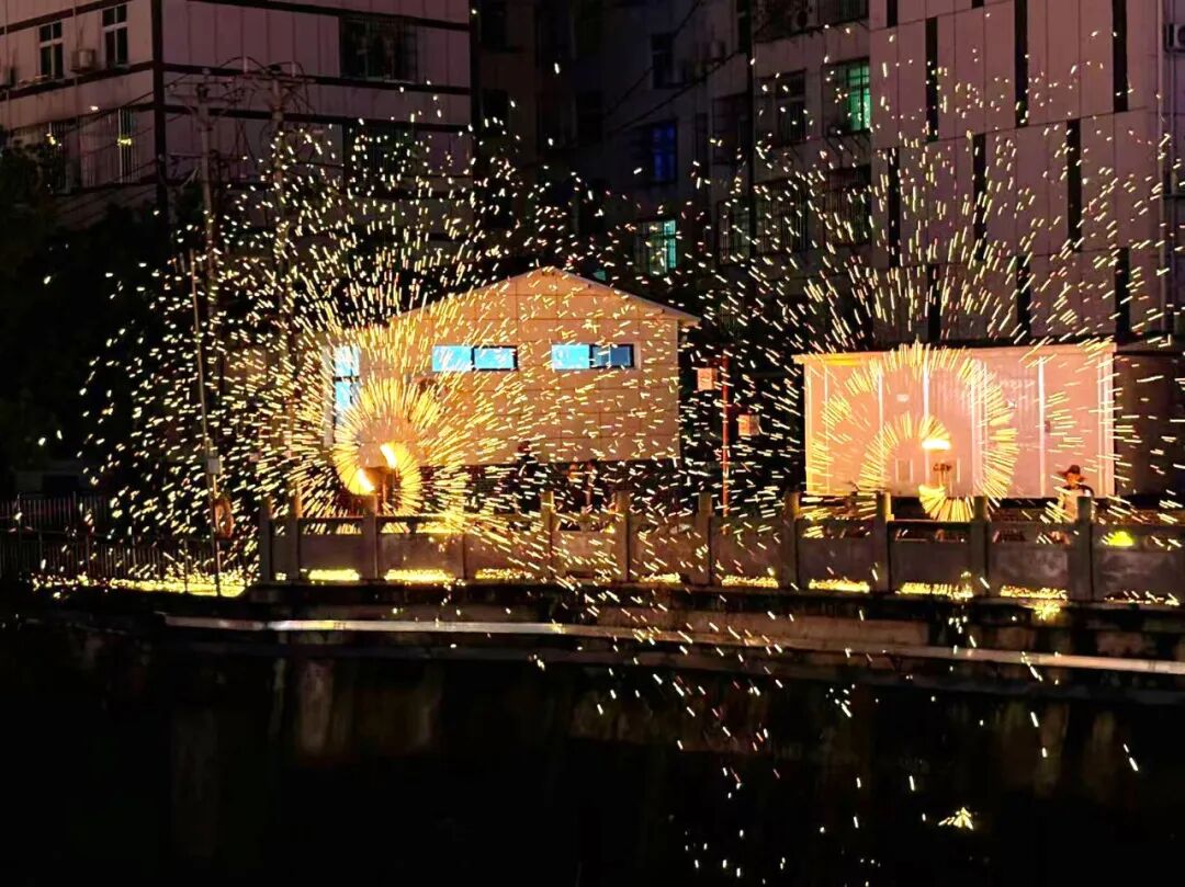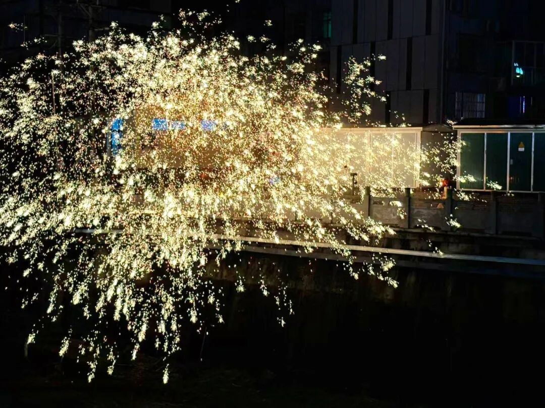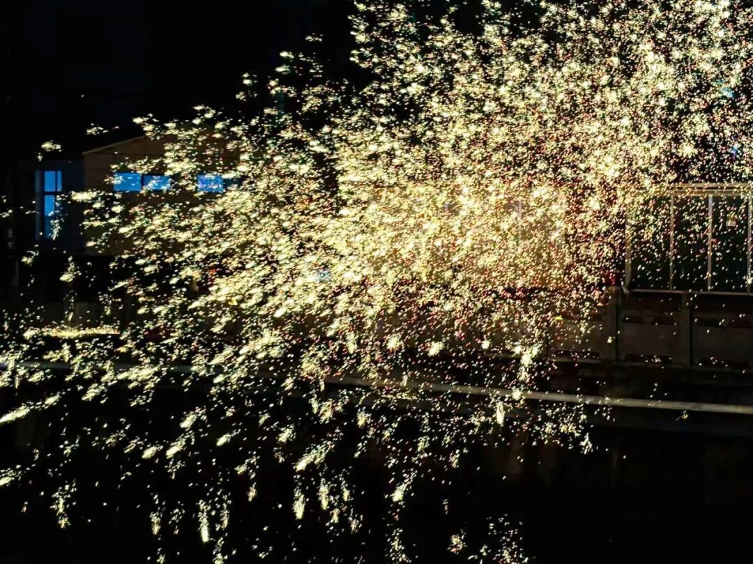 當夜色漸濃時,萬眾期待的打鐵花表演將氣氛推向了高潮!只聽一聲吶喊,滾燙的鐵水被奮力潑向夜空,剎那間萬千火星如金龍狂舞,又如繁星傾瀉,在漆黑的幕布上,綻放出最璀璨的煙火。