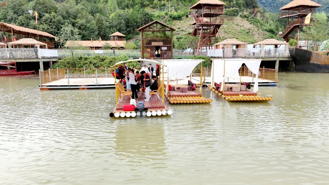 而在一旁的水域,古色古香的游船載著游客緩緩穿行,煙雨朦朧中,兩岸風景如畫,仿佛置身于一幅流動的山水畫卷,別有一番詩意與浪漫。