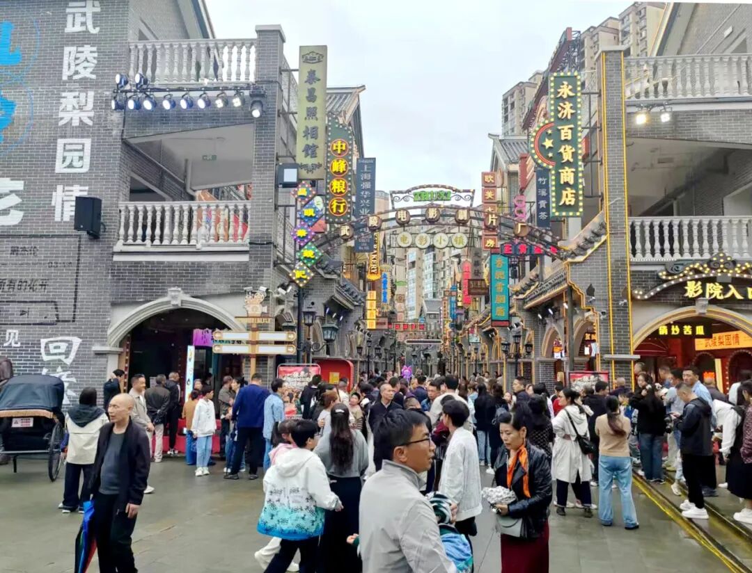 白日場國潮互動歡樂不打烊。雨水洗過的青石板路映襯著街區(qū)的黛瓦飛檐,午后時分,武陵不夜城早已人潮涌動。