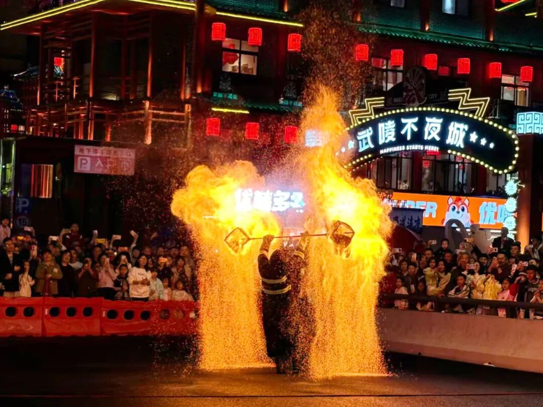 古老技藝的磅礴力量與街區(qū)的現(xiàn)代光影交相輝映,為這個雨中的國慶之夜烙下了一道無比熾熱和難忘的印記。10月4日至7日,每天20:00-20:15、21:00-21:15兩場“打鐵花+火花”表演,帶你來看中式美學天花板。