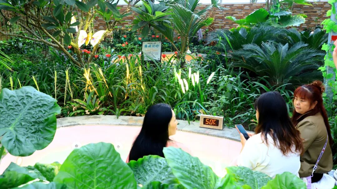 10月4日,記者來到竹溪縣水沐清華園,入口處已排起長隊,游客們有序檢票入園。穿過洗浴區,熱帶風情撲面而來——從熱帶引進的椰子、棕櫚等樹種錯落分布在湯池兩側,讓泳池區域宛如“小三亞”,不少家庭正帶著孩子在恒溫泳池里嬉戲,水花與笑聲交織成歡樂的樂章。