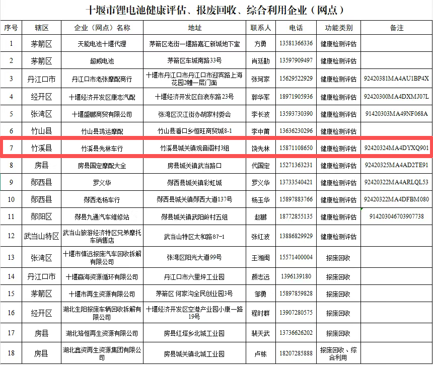 近日十堰消防部門公布全市首批健康評估和報廢回收網點可提供電池檢測、評估服務其中竹溪設有1個網點: