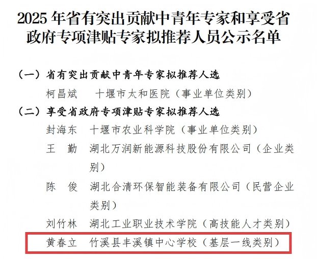 日前,十堰市人力資源和社會(huì)保障局在十堰政府網(wǎng)發(fā)布《關(guān)于推薦我市2025年省有突出貢獻(xiàn)中青年專(zhuān)家和享受省政府專(zhuān)項(xiàng)津貼專(zhuān)家人選公示》,竹溪縣豐溪鎮(zhèn)中心學(xué)校黃春立入選,詳情如下: