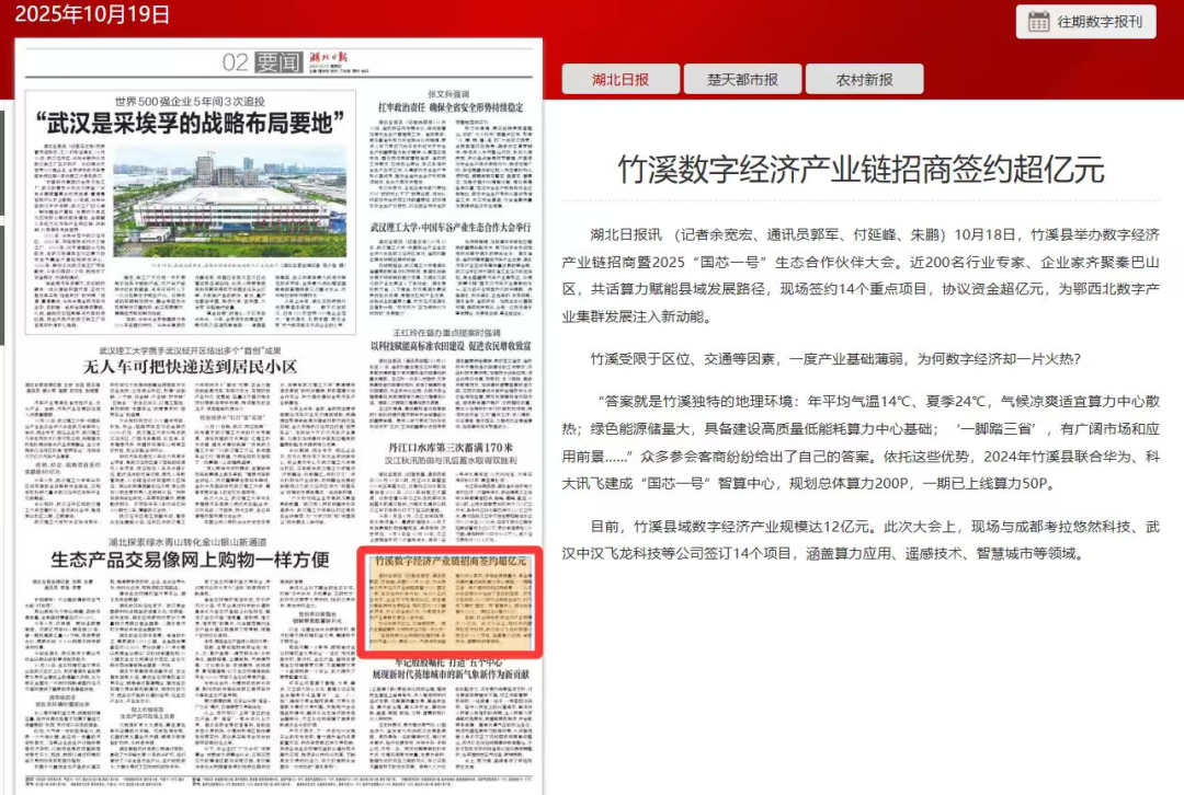 此外,10月17日,湖北衛(wèi)視公共新聞?lì)l道《直通十堰》欄目以《竹溪:算力+大模型!打造秦巴區(qū)域“芯”動(dòng)力》為題報(bào)道,竹溪縣搶抓區(qū)域算力發(fā)展空白,積極打造秦巴地區(qū)重要的算力樞紐,通過智算中心+特色行業(yè)大模型推動(dòng)AI產(chǎn)業(yè)快速發(fā)展,為十堰數(shù)字經(jīng)濟(jì)高質(zhì)量發(fā)展注入強(qiáng)勁動(dòng)能。