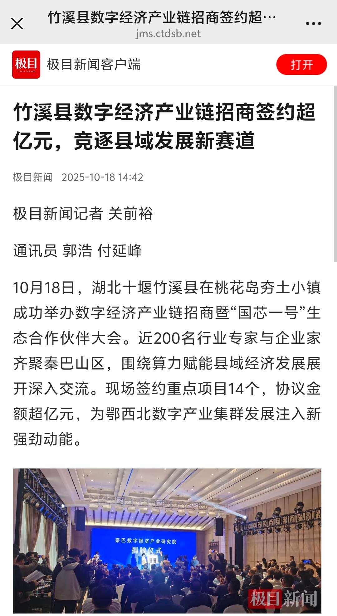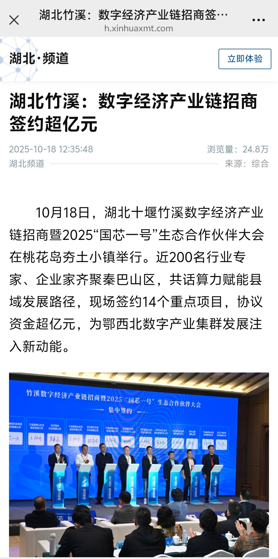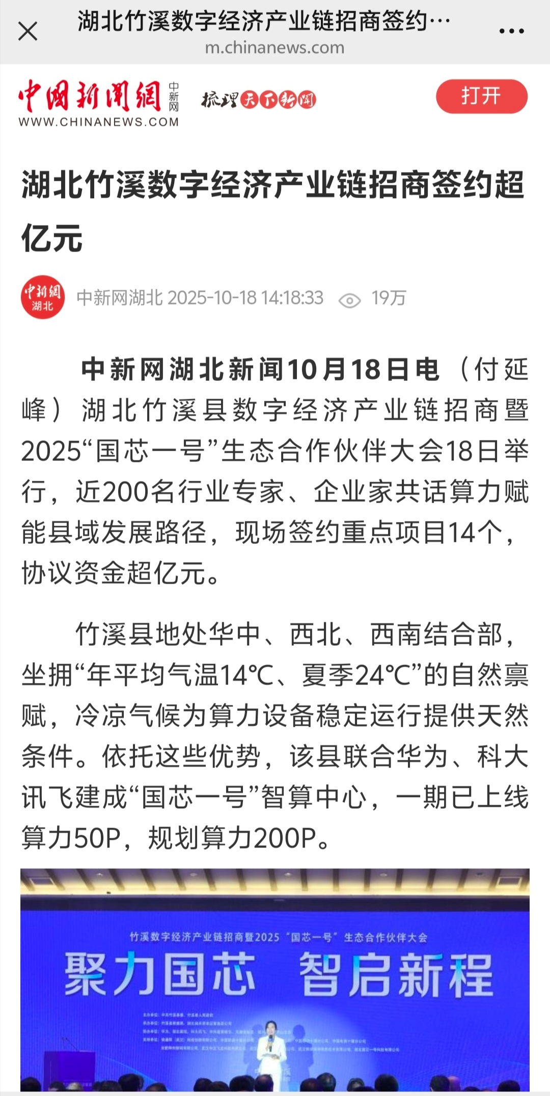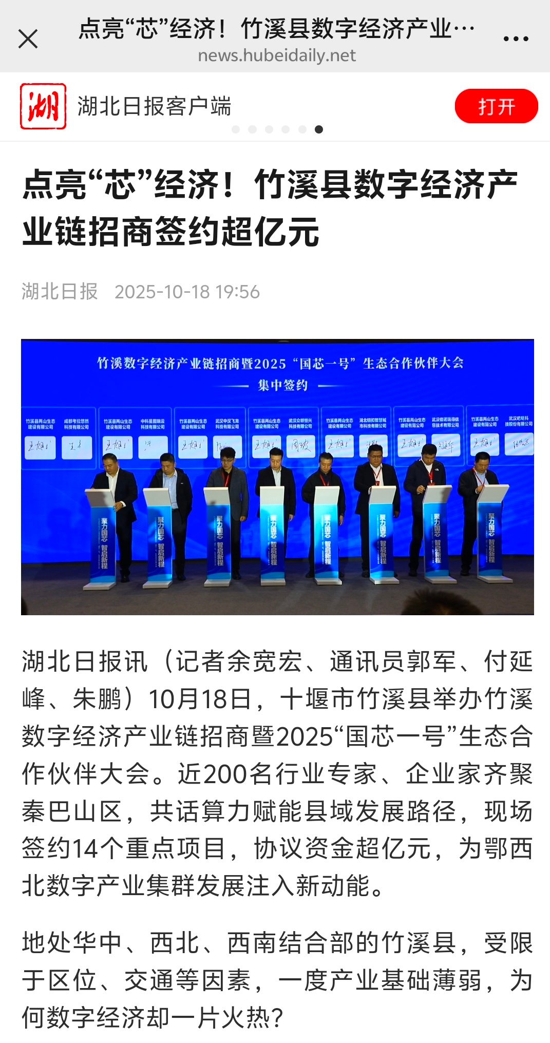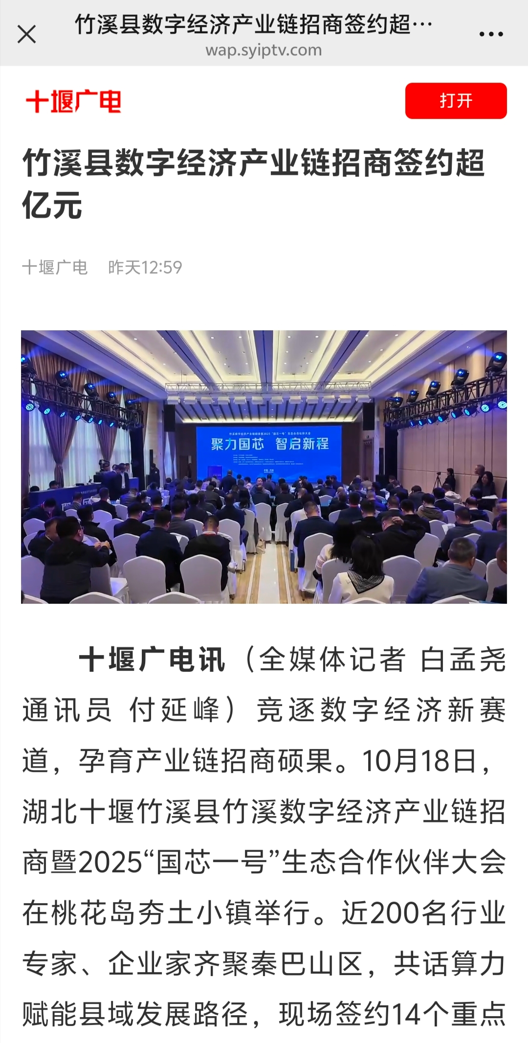 昨天(10月18日),竹溪數(shù)字經(jīng)濟(jì)產(chǎn)業(yè)鏈招商暨2025“國芯一號(hào)”生態(tài)合作伙伴大會(huì)舉行,這場(chǎng)數(shù)字經(jīng)濟(jì)領(lǐng)域的盛會(huì)吸引了國家、省、市主流媒體高度關(guān)注,新華社、中國新聞網(wǎng)、湖北日?qǐng)?bào)、荊楚網(wǎng)、長(zhǎng)江云新聞、極目新聞、湖北日?qǐng)?bào)客戶端、十堰廣電等媒體紛紛推出報(bào)道,小微收集整理了,近期已推出的精彩報(bào)道快來看看。