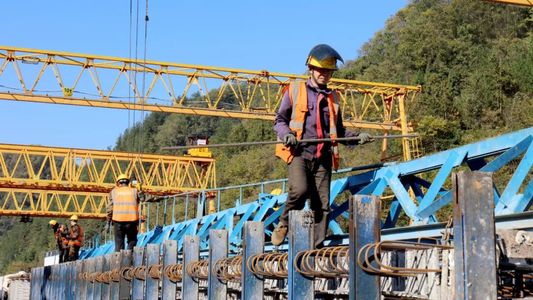 竹溪新聞網訊 記者 段銳 馮昊 通訊員 師梅婷 報道:秋高氣爽,秦巴山腹地機械轟鳴,震徹山谷。在十巫南高速公路豐溪段SWYZ-6標施工現場,塔吊巨臂凌空揮舞,運輸車輛往來穿梭,施工人員正緊鑼密鼓地進行預制T梁的扎捆、焊接與架設作業,以全力沖刺的姿態搶抓金秋施工黃金期。