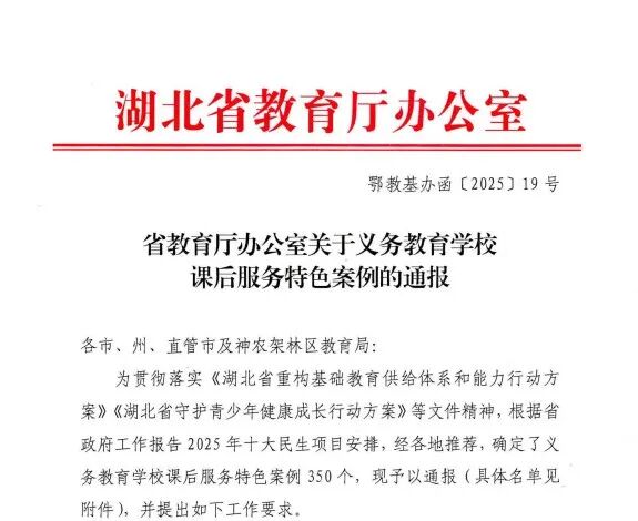 近日,湖北省教育廳辦公室公布全省義務教育學校課后服務特色案例名單,竹溪縣思源實驗學校、竹溪縣蔣家堰鎮佛臺小學兩校的典型案例,憑借鮮明的育人特色與扎實的實施成效,在全省眾多案例中脫穎而出成功入選。