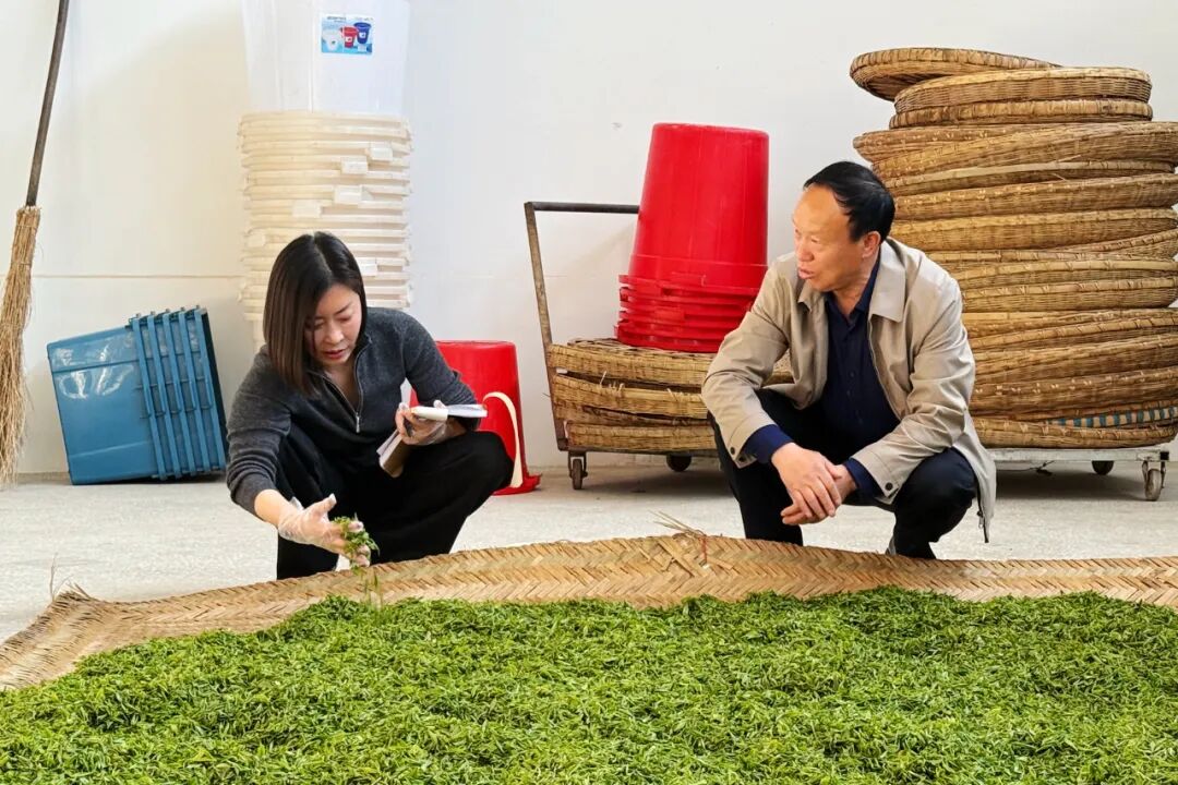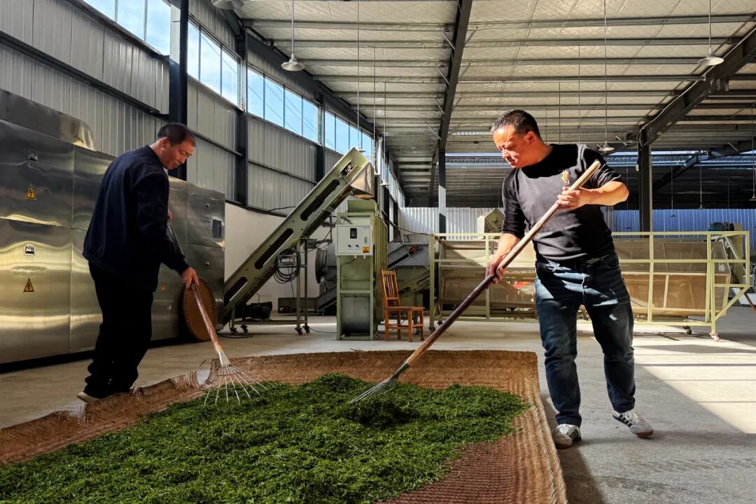 當天,湖北四點靈茶業有限公司加工車間里熱鬧非凡,茶園開園,茶機生產,村民們背著裝滿新鮮茶葉的口袋絡繹不絕地前來售賣。工作人員忙著稱重、分級、攤晾,車間內人來人往,一派繁忙。大片竹席上晾曬著翠色欲滴的嫩芽,宛若一條條通透的綠絲帶,還不時散發出陣陣清香。