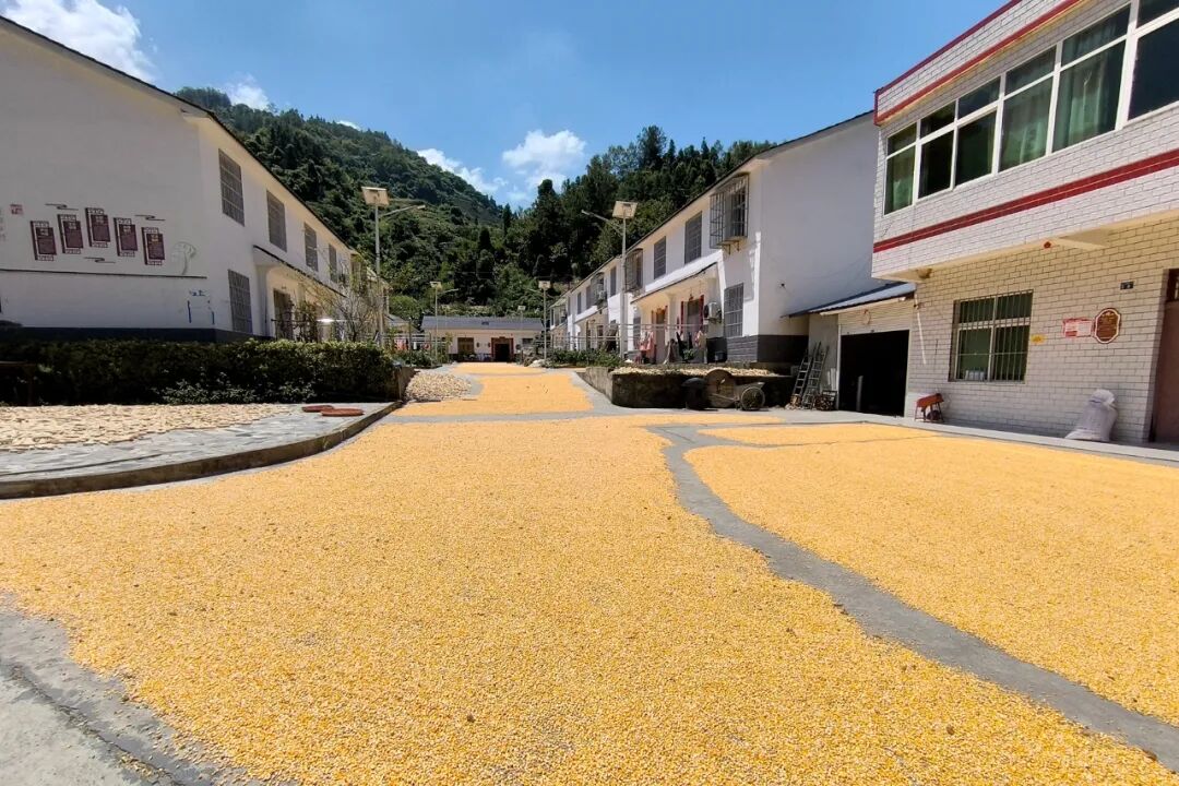 院內,村民剛剛收獲的玉米被整齊地晾曬在地面上,在陽光照耀下閃爍著金色的光芒。