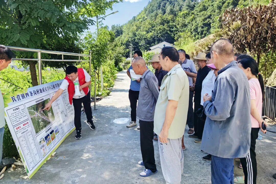 在兵營鎮四條溝村,村黨支部書記馮剛對照著該村的地質災害應急處置指引圖,現場向地災監測員和地災影響戶講解應急避險轉移路線、應急處置避險流程。地災監測員們“一圖讀懂”了防災避災的關鍵要領。