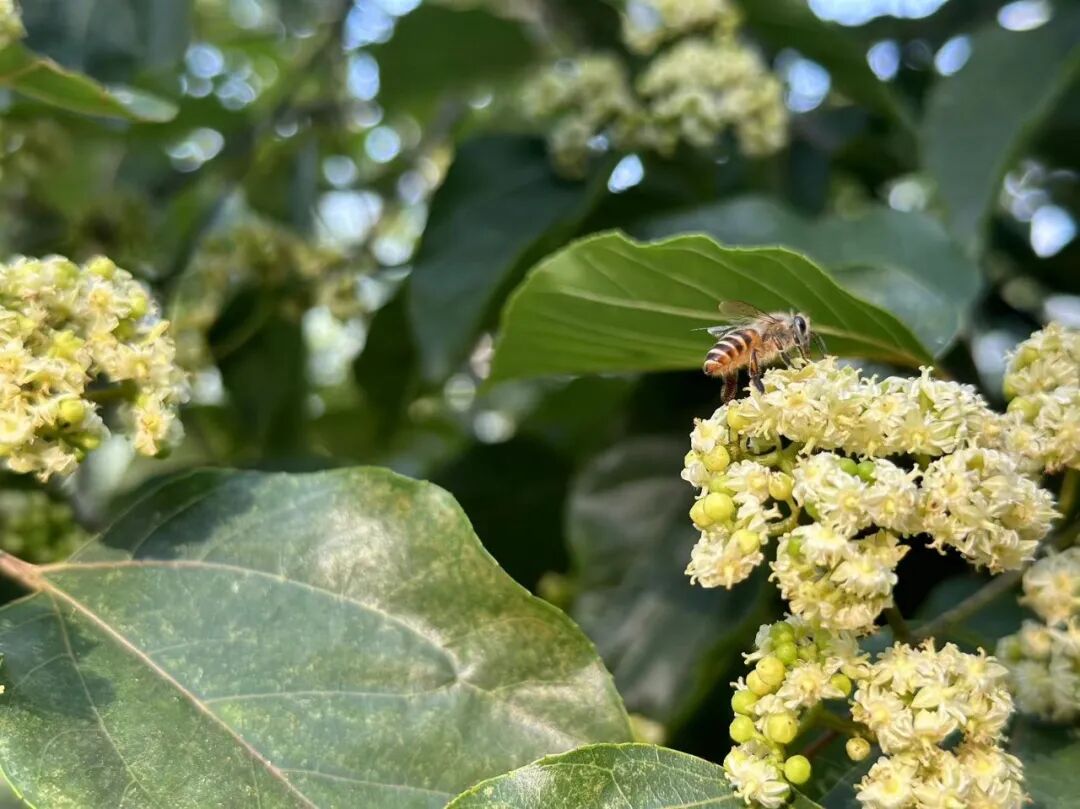 村民一邊修剪,朱明言一邊慢慢將剪落的茶樹枝葉劃到地上。“這些修剪掉的茶樹枝葉回歸土壤后就會漸漸變成新的肥料,為拐棗樹和茶樹提供天然養(yǎng)料。等到六月初,拐棗樹上的這些花苞就開花了,淡淡的黃色小花可漂亮了。”朱明言一邊劃拉著樹枝一邊笑著說道。