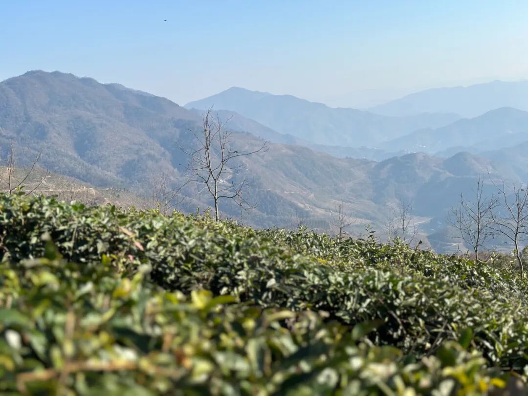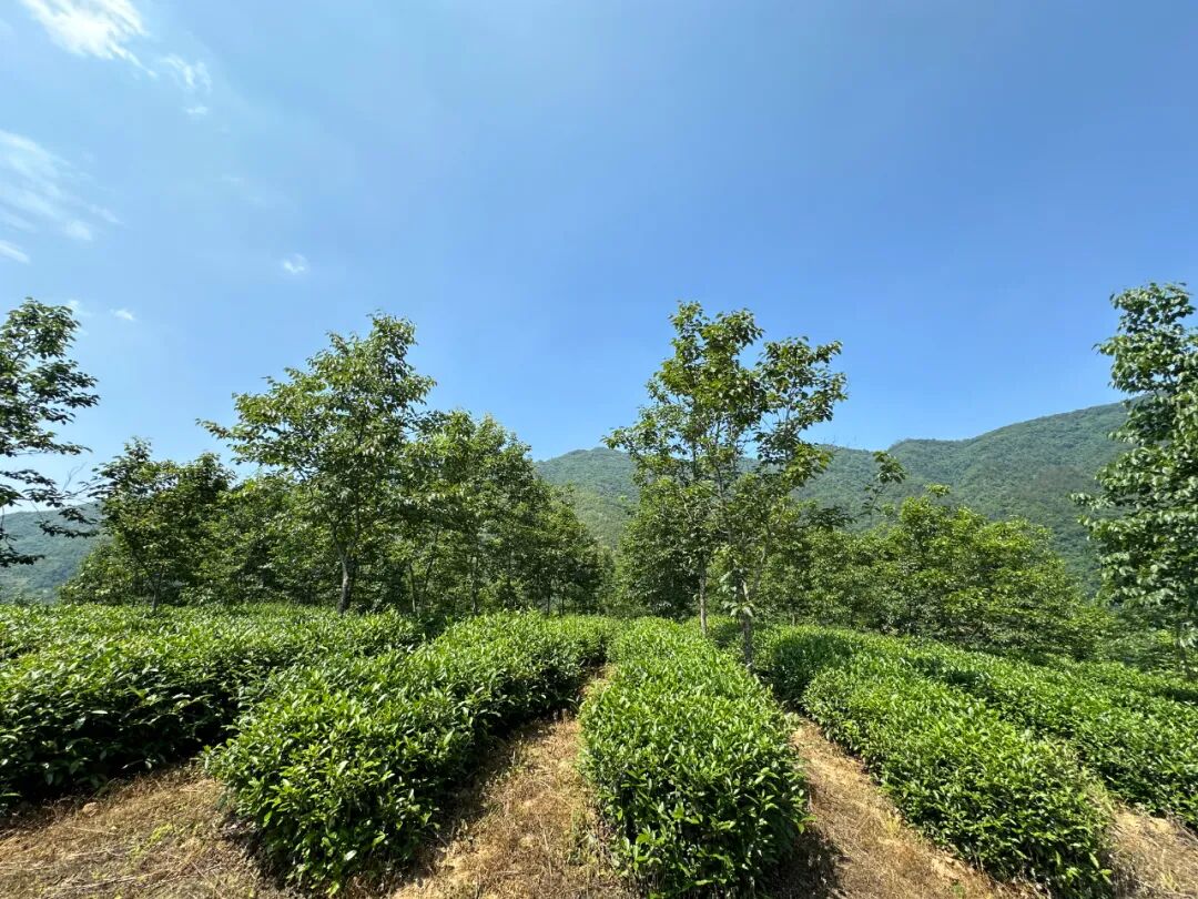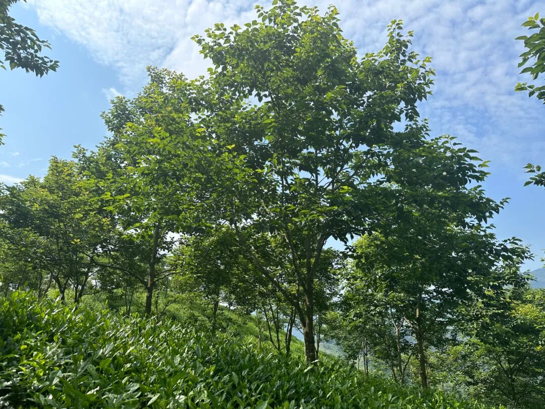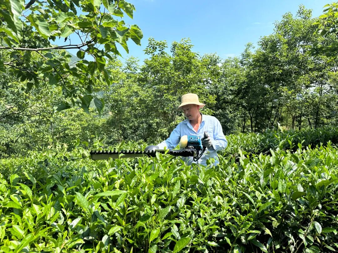 靜謐的高山上,炙熱的陽光透過高大的拐棗樹枝灑在蔥郁的茶樹上,成片的茶山中,頭戴草帽的村民們正精心修剪茶樹,轟鳴的電鋸聲在茶園里回響,打破了林間的寂靜。