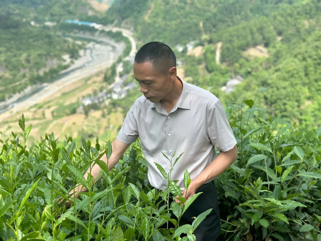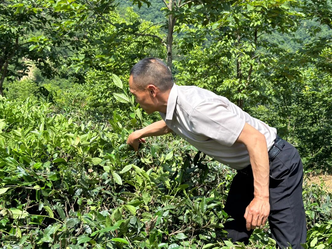 村民們口中的“朱老板”便是帶領(lǐng)他們增收致富的“排頭兵”——朱明言。只見他消瘦的身軀,在烈日下悉心查看茶園里拐棗樹的長勢,長時間浸在山地里“取經(jīng)”,他的皮膚變成了小麥色,褪去了“老板”的模樣,顯得更加樸實。